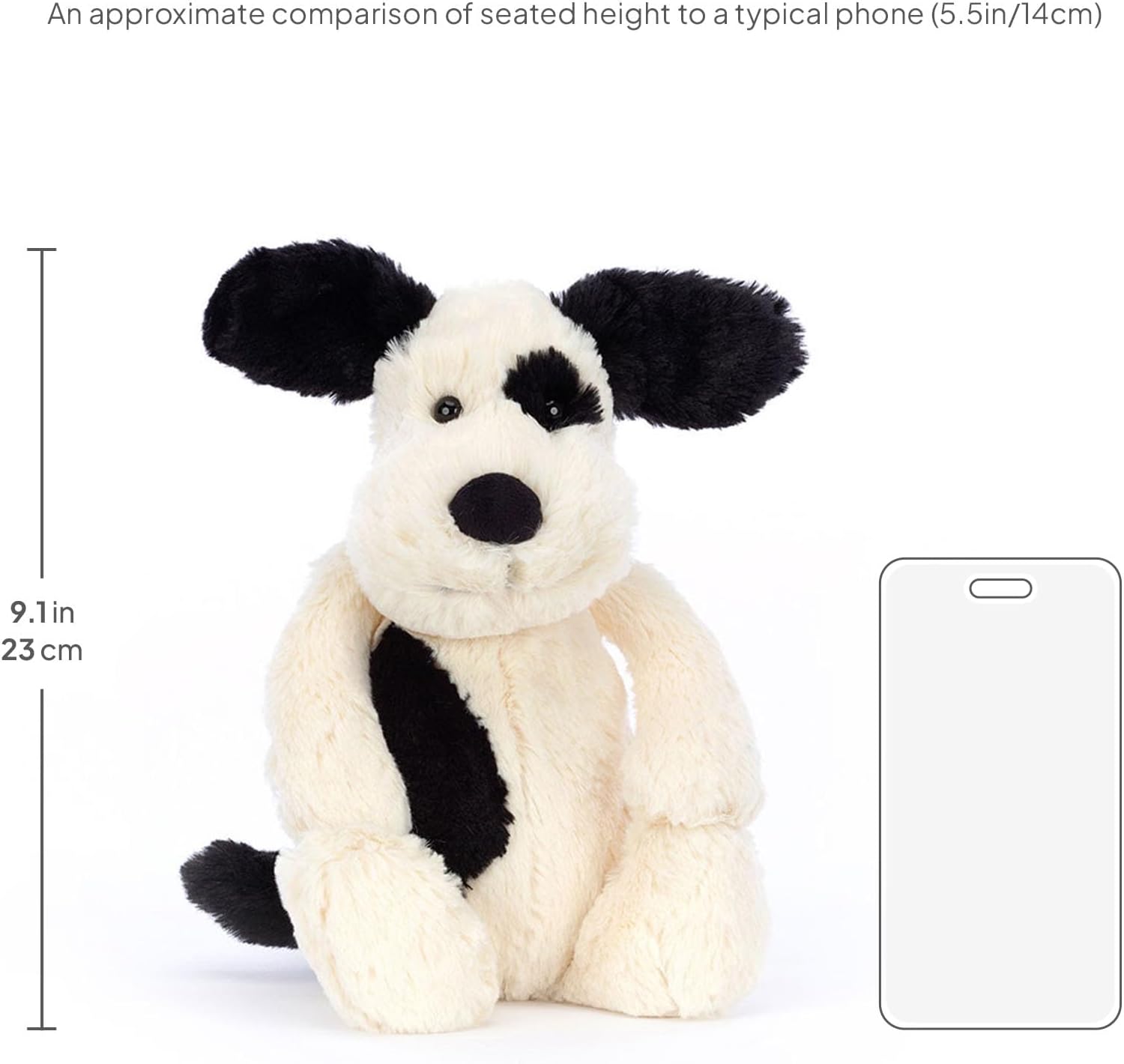 - Dimensions: Medium Bashful Black and Cream Puppy measures 12.2 x 4.7 x 3.5 inches. Sitting height is 9.1 inches.