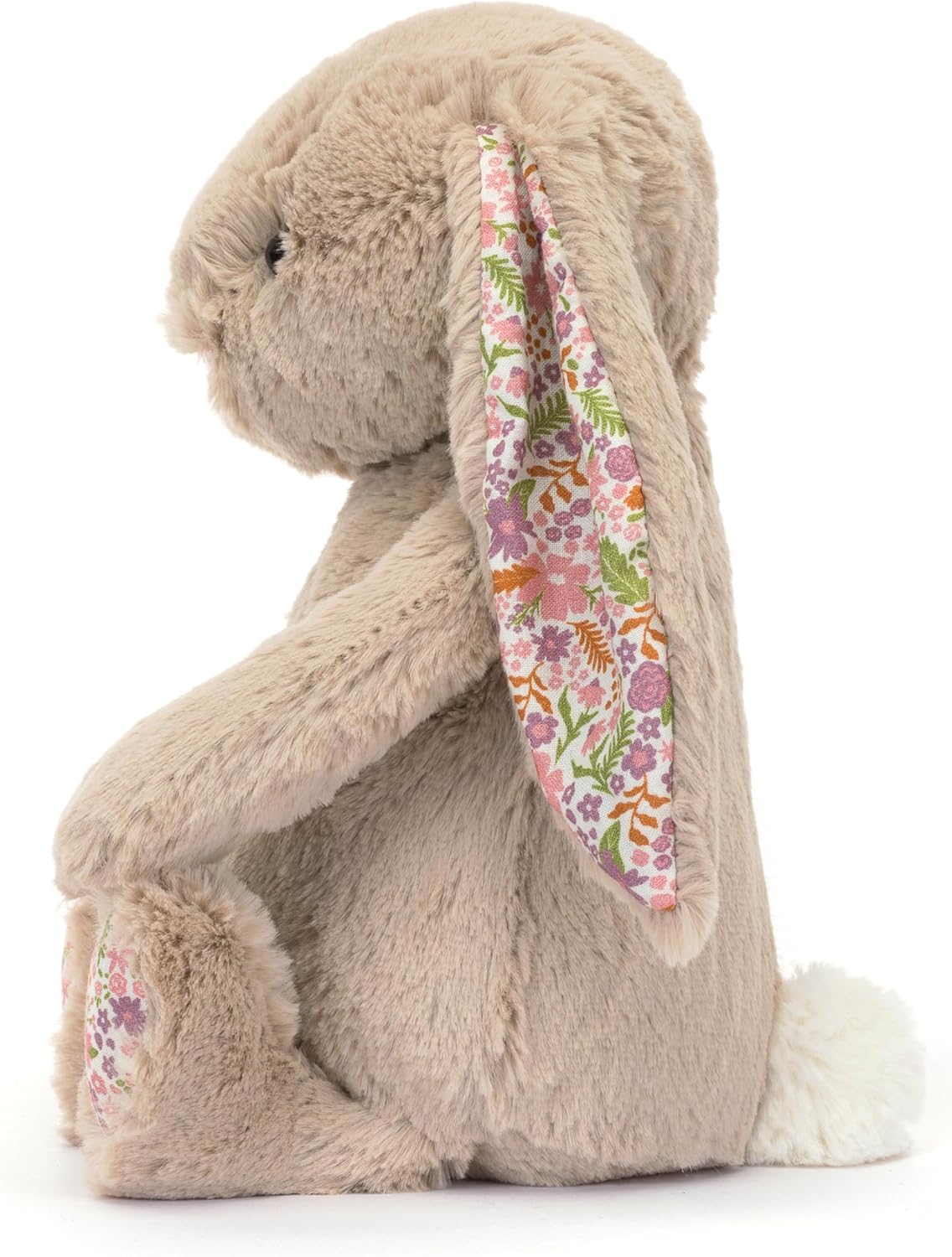 Blossom Beige Bunny has been frolicking in the meadows, and has found some special flowers. In iconic Bashful beige fur with a cream bobtail, Blossom Beige Bunny has soft cotton floral ears and feet, printed with an original Jellycat design of pink and purple flowers. Bringing floral patterned joy to all ages!