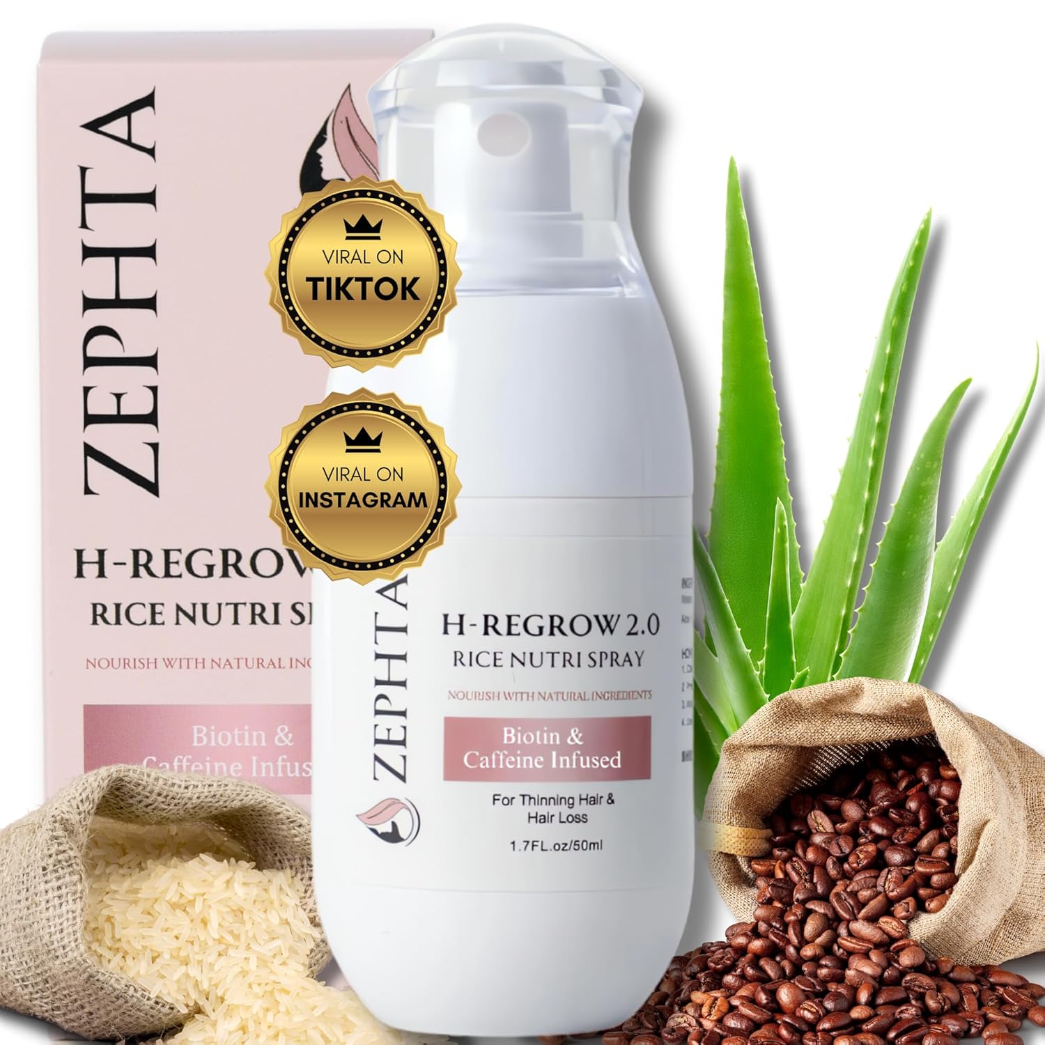 Zephta H-Regrow 2.0 Rice Nutri Spray for Hair Growth with Biotin and Caffeine, Stimulates Hair Follicles, Promotes Thicker Fuller Hair.